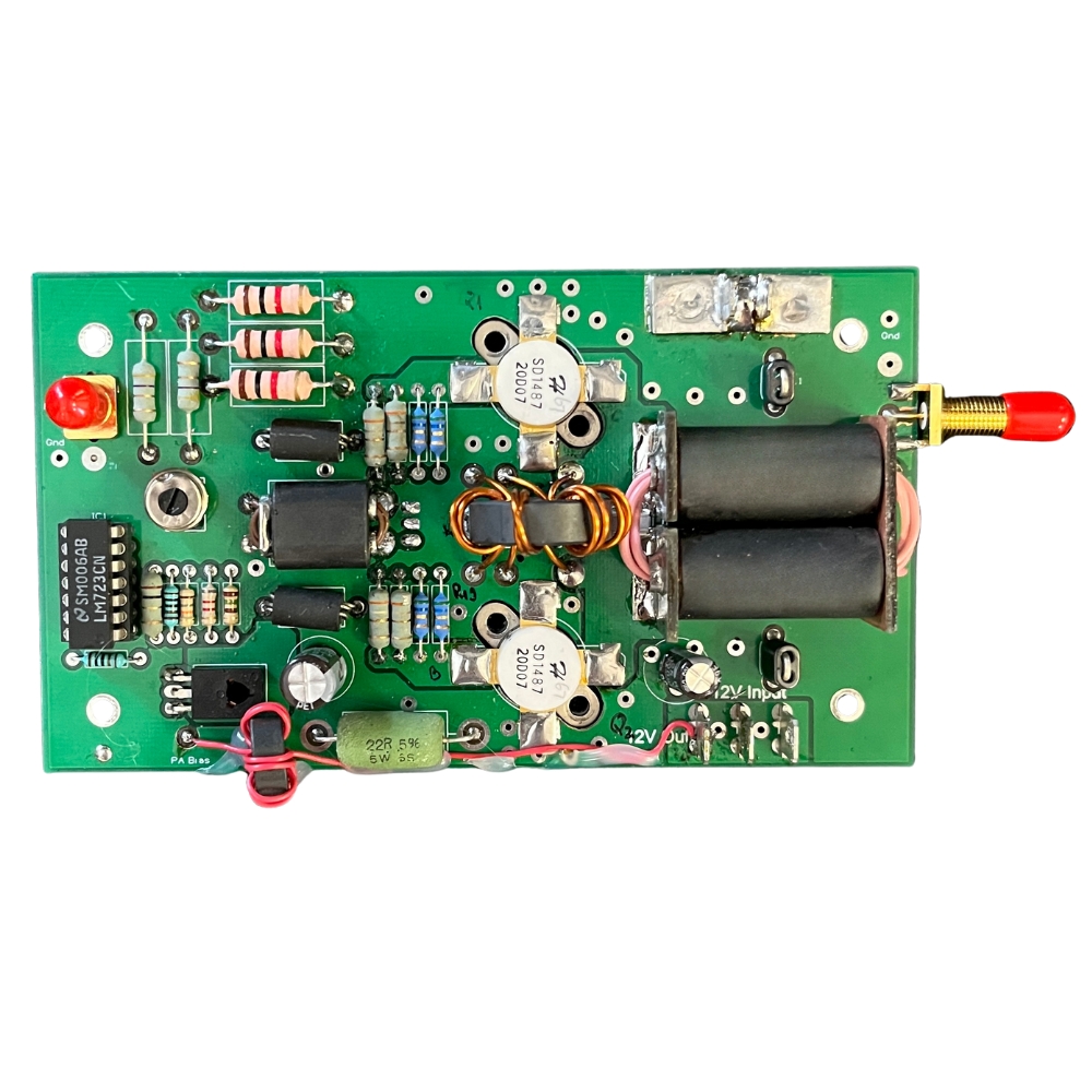 The PA150+ is an RF amplifier module developed in our lab as an experimental re-design of the classic AN762 and G6ALU architectures. Designed for extensive testing and demonstration purposes, we have assembled multiple units, fully populating all manufactured PCBs. Initial results are highly promising, and we are currently preparing a comprehensive engineering report detailing the performance. The design is a push-pull, Class-AB amplifier utilizing bipolar BJTs — either 2 x 2SC2879 or 2 x SD1487 (HG Semi). It does not include heatsink. Key performance figures include: